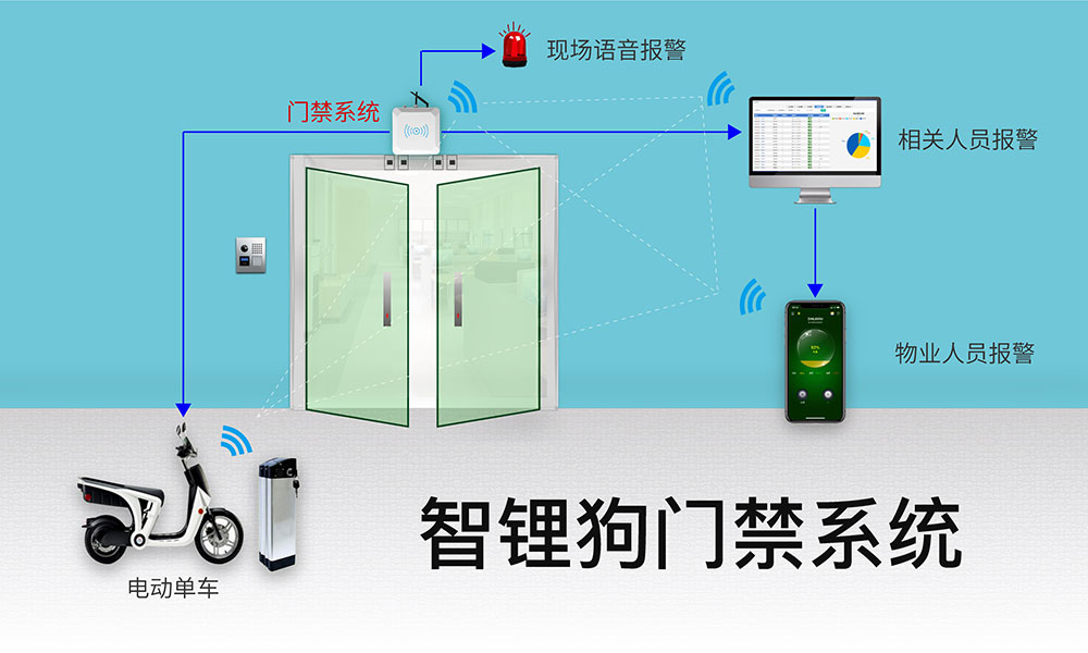 智锂狗门禁系统通过无线技术检测电动车(电池), 在公共门厅的出入口安装智锂狗门禁系统控制器,当有电动车(电池)靠近公共门厅时,智锂狗门禁系统控制器立即发出语音警报并及时通知管理人员, 防止电动车进入室内使用不当引发着火爆炸,避免造成人员伤亡及财产损失等重大事故的发生!